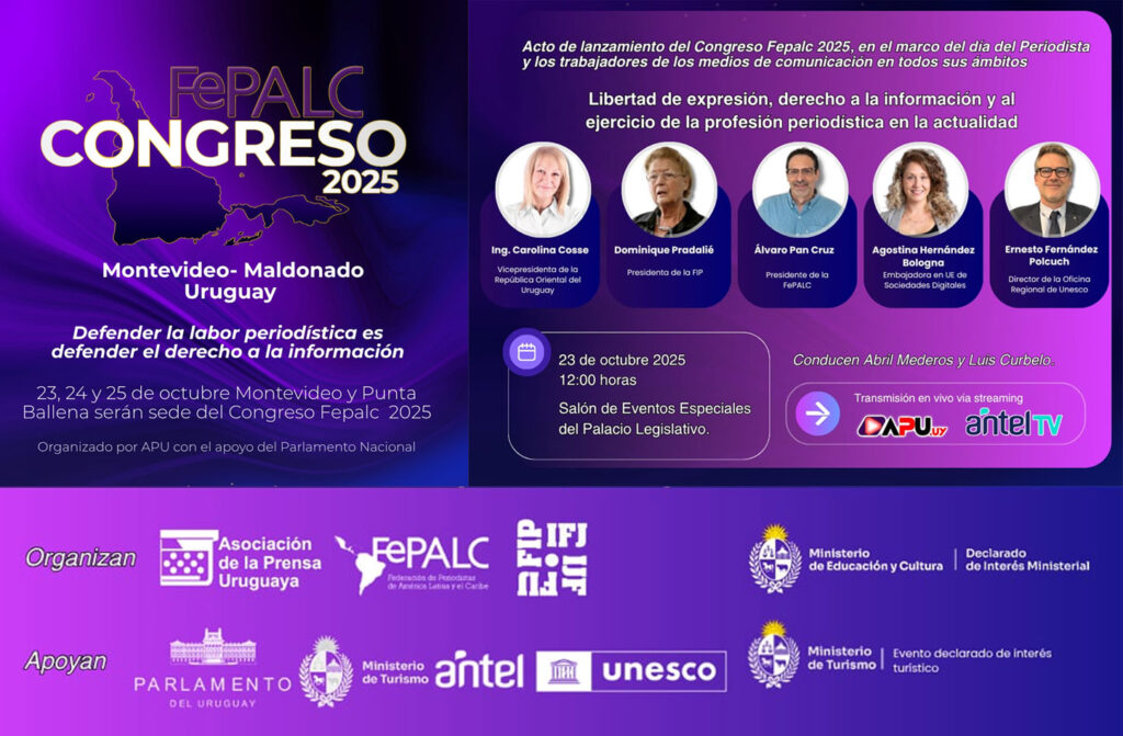 Del 23 al 25 de octubre de 2025, se celebrará en Montevideo y Maldonado (Uruguay) el Congreso de la Federación de Periodistas de América Latina y el Caribe (FePALC), bajo el lema “Defender la labor periodística es defender el derecho a la información”.
